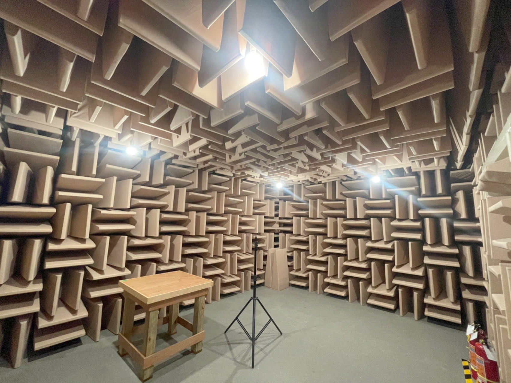 从消声室所用的吸声材料来看,要求吸声系数大于0.99。一般使用渐变吸收层,常用尖劈或圆锥结构,以玻璃棉作吸声材料,也有用软泡沫塑料的。在消声室中进行试验时,被测试的对象或声源等置于中央的尼龙丝网或钢丝网上,由于此类网能承受的重量有限,故只能测试重量轻、体积小的声源等。